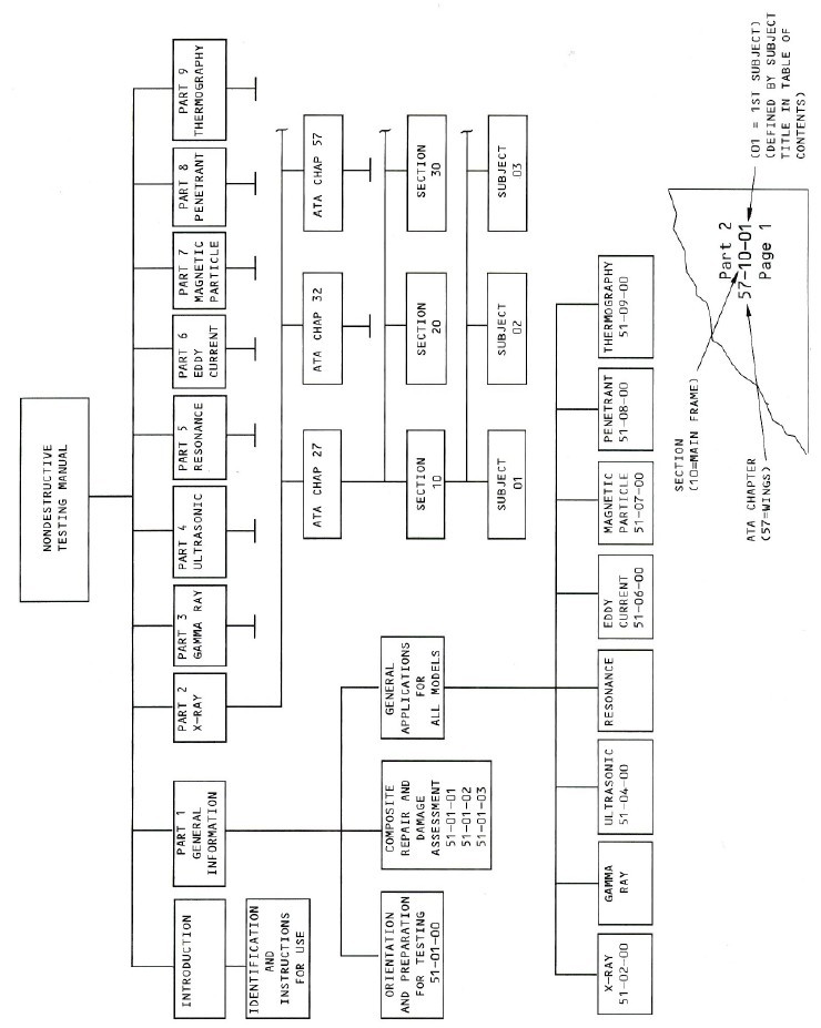 作為NDT 人員應對所維護的機型的無損檢測手冊(NTM)有清晰的了解,能夠了解不同機型無損檢測要求的差異,掌握無損檢測手冊中各種檢測方法的通用要求,熟練應用無損檢測手冊中各種檢測程序指導檢測工作。由于所有機型的無損檢測手冊都是按照ATA 規范編寫的(ATA100 2-9《無損檢測手冊》),因此不同機型的無損檢測手冊的格式基本是一樣的。下面就按照BOEING NDTM 和AIRBUS NTM 及CMM 進行介紹。