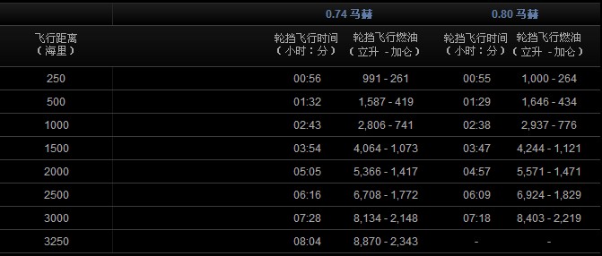 輪擋時間及輪擋燃油 假設條件: A1E發動機; ISA; 無風。 NBAA IFR 備份燃油: 8名乘客