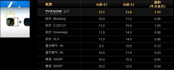 飛鴻300公務機最佳價值 1 - 按照2008年5月出版的公務/商用飛機采購手冊的說明,所有飛機的航程均是在攜帶了符合NBAA IFR 規定的飛往100海里備降場的備份燃油量,并且搭載4位乘客每位重200磅的基礎上給出的。 2 - 國際標準大氣、最大起飛重量、海平面。 3 - 所有競爭對手產品的價格均在2007/2008年度公務/商用飛機采購手冊數據的基礎上給出。飛鴻300飛機2008年1月的價格等同于2005年1月685萬美元的價格。 窗戶尺寸對比