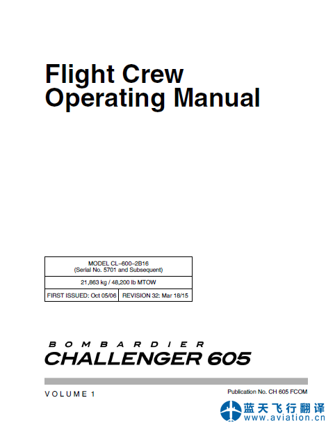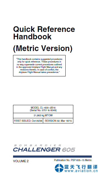 北京藍天飛行翻譯公司完成大型公務機公司的第32版/2015年3月18日版本龐巴迪挑戰者605全套飛行手冊翻譯任務:第32版龐巴迪挑戰者605飛機飛行手冊、機組操作手冊、快速檢查單 Revision 32 Mar 18/15 Bombardier Challenger 605 Airplane Flight Manual, Flight Crew Operating Manual, Quick Reference Handbook Translation ![]() 龐巴迪挑戰者605飛機飛行手冊 Bombardier Challenger 605 Airplane Flight Manual ![]() 龐巴迪挑戰者605機組操作手冊第一冊 Bombardier Challenger 605 Flight Crew Operating Manual ![]() 龐巴迪挑戰者605機組操作手冊 Bombardier Challenger 605 Flight Crew Operating Manual ![]() 龐巴迪挑戰者605快速檢查單第一冊 Bombardier Challenger 605 Quick Reference Handbook ![]() 龐巴迪挑戰者605快速檢查單第二冊 Bombardier Challenger 605 Quick Reference Handbook |