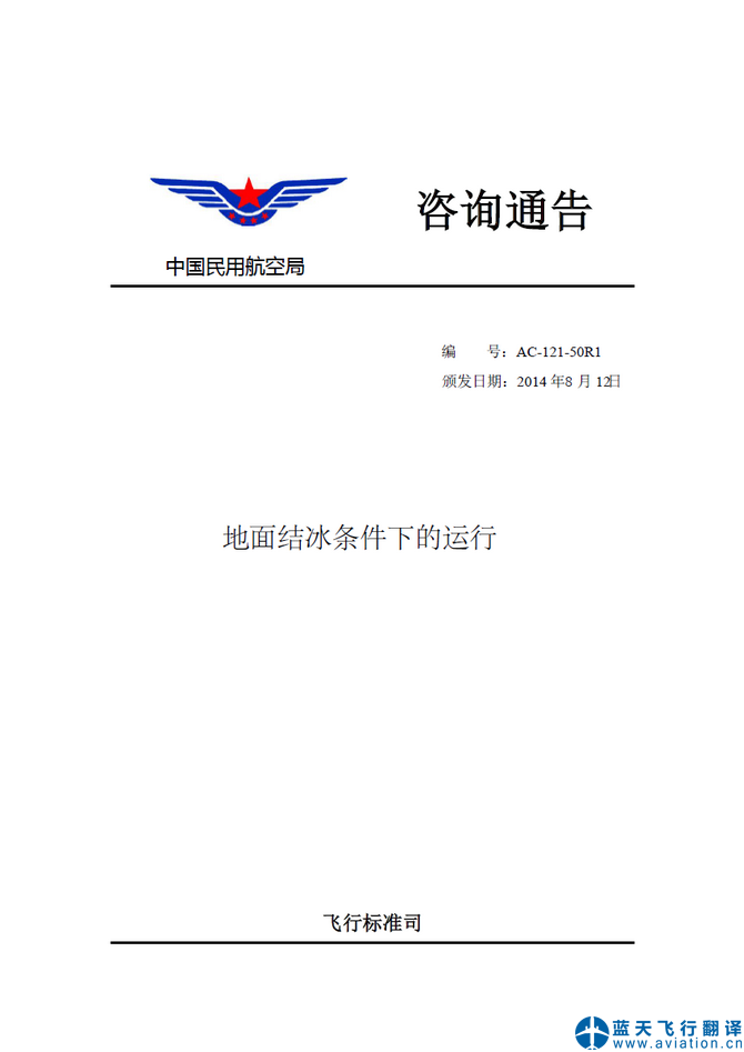 北京藍天飛行翻譯公司承接中國民用航空局飛行標準司地面結冰條件下的運行咨詢通告翻譯 CAAC Advisory Circular Translation: Ground Operation In Icing Conditions ![]() 地面結冰條件下的運行咨詢通告 地面結冰條件下的運行咨詢通告的內容包含有: 中國民用航空局咨詢通告