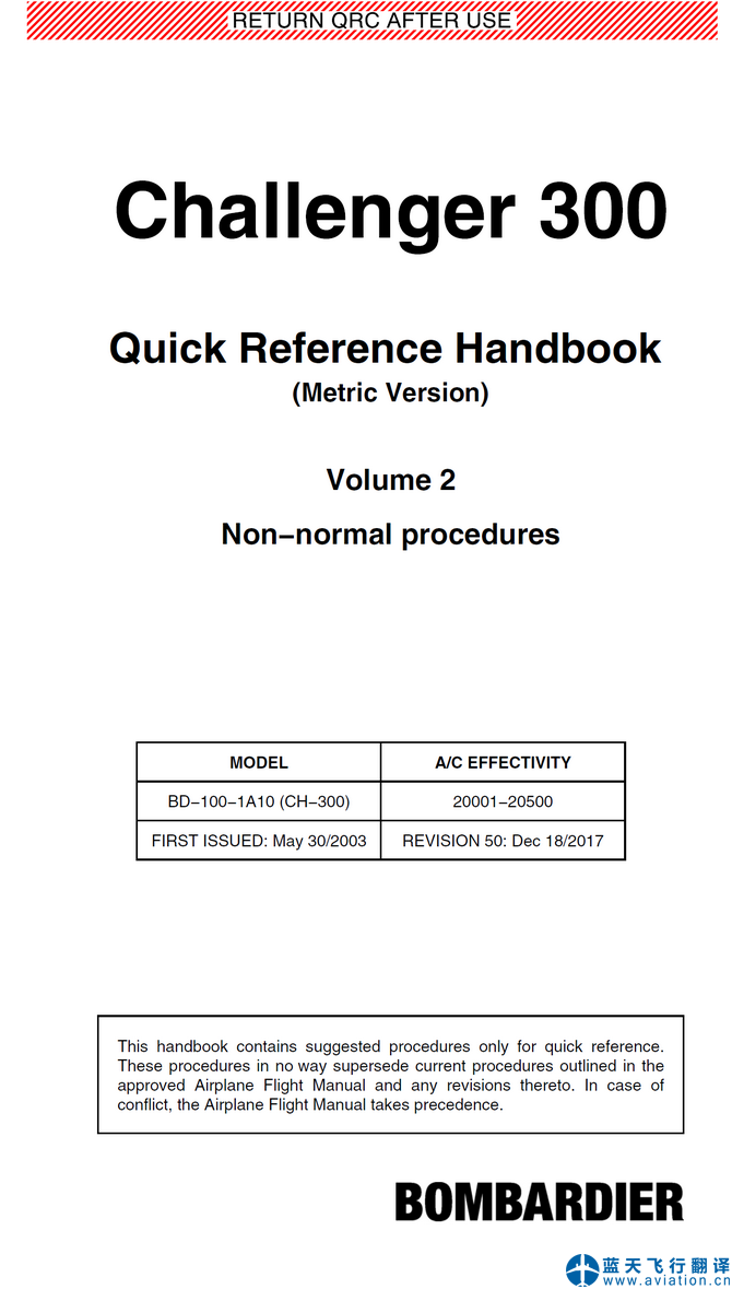 北京藍(lán)天飛行翻譯公司完成大型公務(wù)機公司2017年12月18日版本龐巴迪挑戰(zhàn)者300公務(wù)機快速檢查單翻譯任務(wù) Rev 50, Dec 18/2017 Bombardier Challenger 300 Quick Reference Handbook Translation