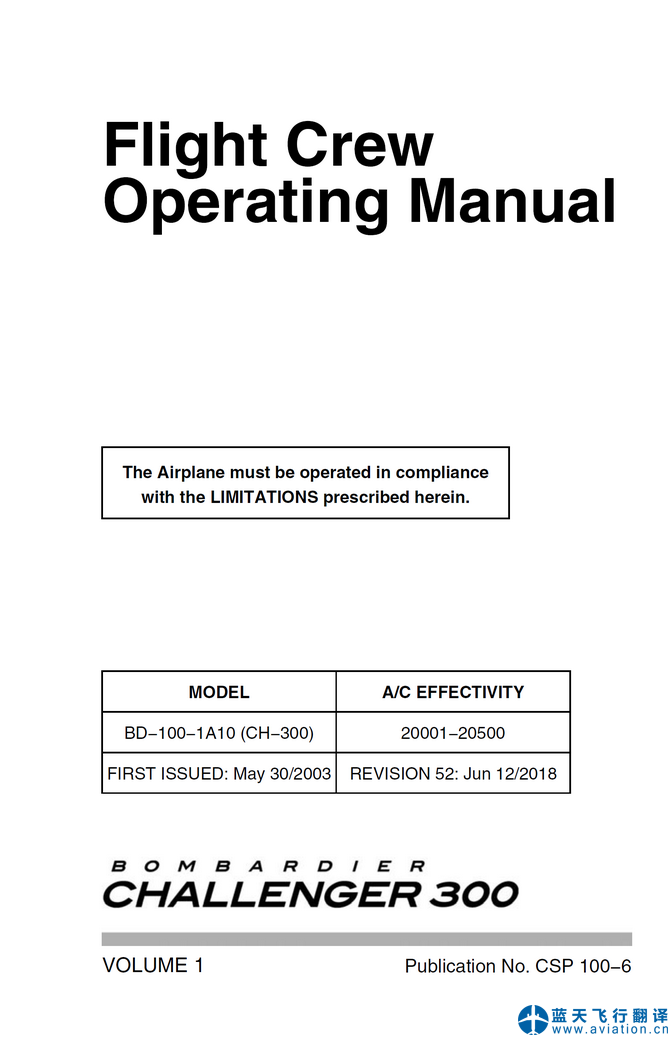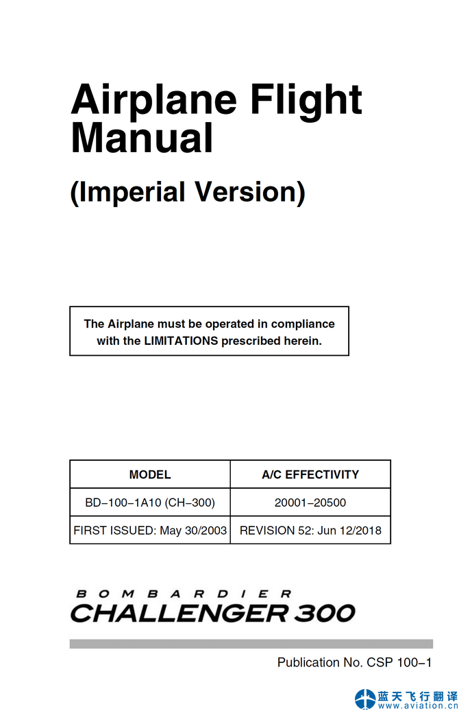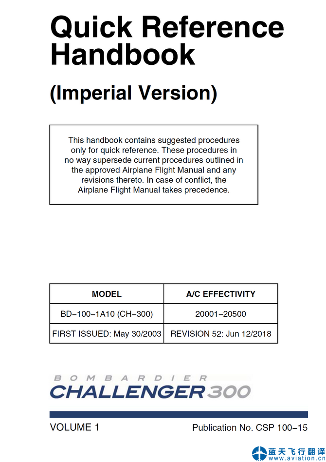 北京藍天飛行翻譯公司承接公務機公司2018年6月12日第52版龐巴迪挑戰者300公務機全套飛行手冊翻譯任務 REVISION 52: Jun 12/2018 Bombardier Challenger 300 Flight Crew Operating Manual, Airplane Flight Manual and Quick Reference Handbook Translation