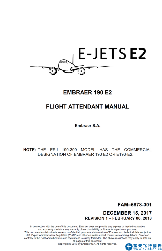 北京藍天飛行翻譯公司承接航空公司 EMBRAER 190 E2 乘務(wù)員手冊翻譯任務(wù) EMBRAER 190 E2 FLIGHT ATTENDANT MANUAL Translation