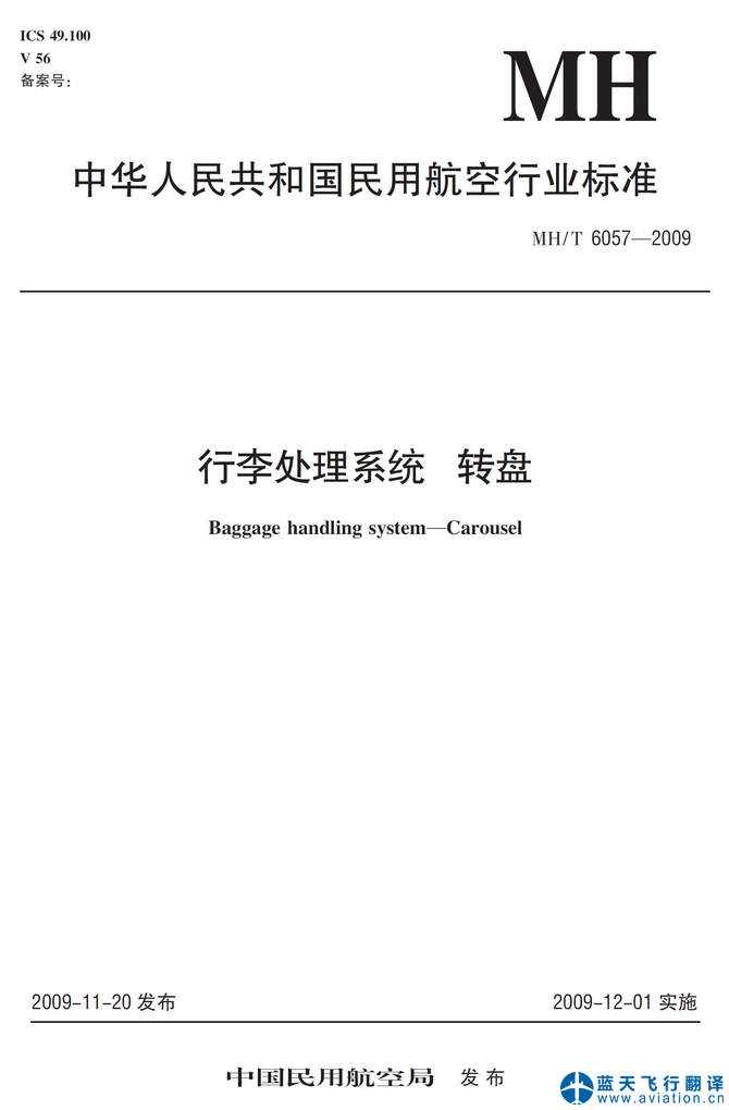 北京藍天飛行翻譯公司承接中國民用航空局發布的中華人民共和國民用航空行業標準行李處理系統轉盤翻譯任務 Baggage handling system—Carousel, Civil Aviation Industrial Standard Translation![]() 中華人民共和國民用航空行業標準行李處理系統轉盤 中華人民共和國民用航空行業標準行李處理系統轉盤(Baggage handling system—Carousel)的主要內容包含有: