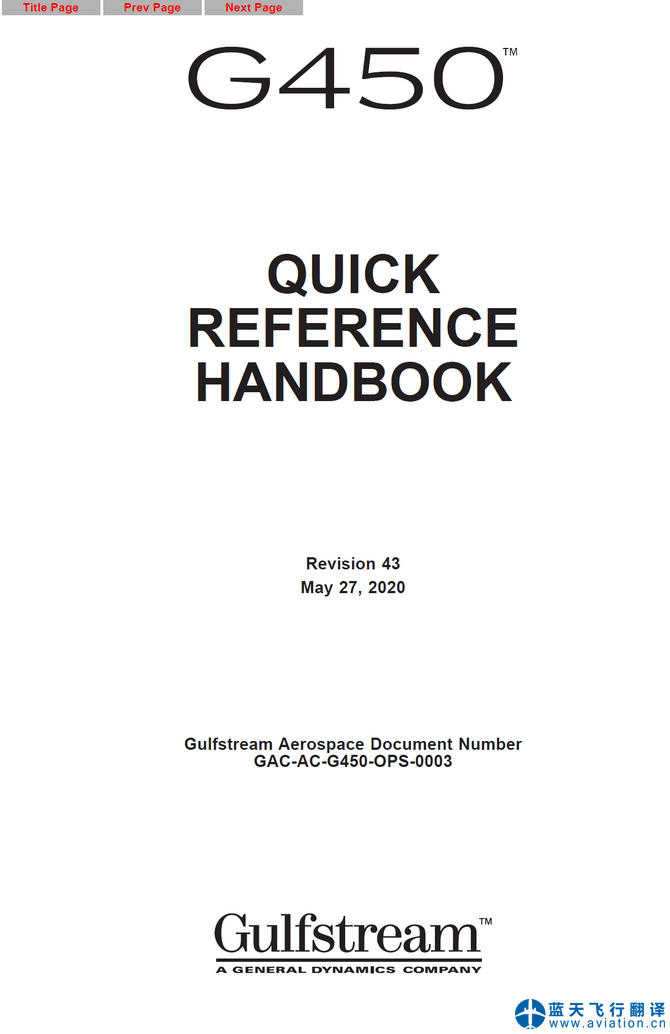北京藍天飛行翻譯公司完成大型公務機公司的2020年5月27日版本灣流G450快速檢查單翻譯任務 Revision 43 May 27, 2020 G450 QUICK REFERENCE HANDBOOK Translation