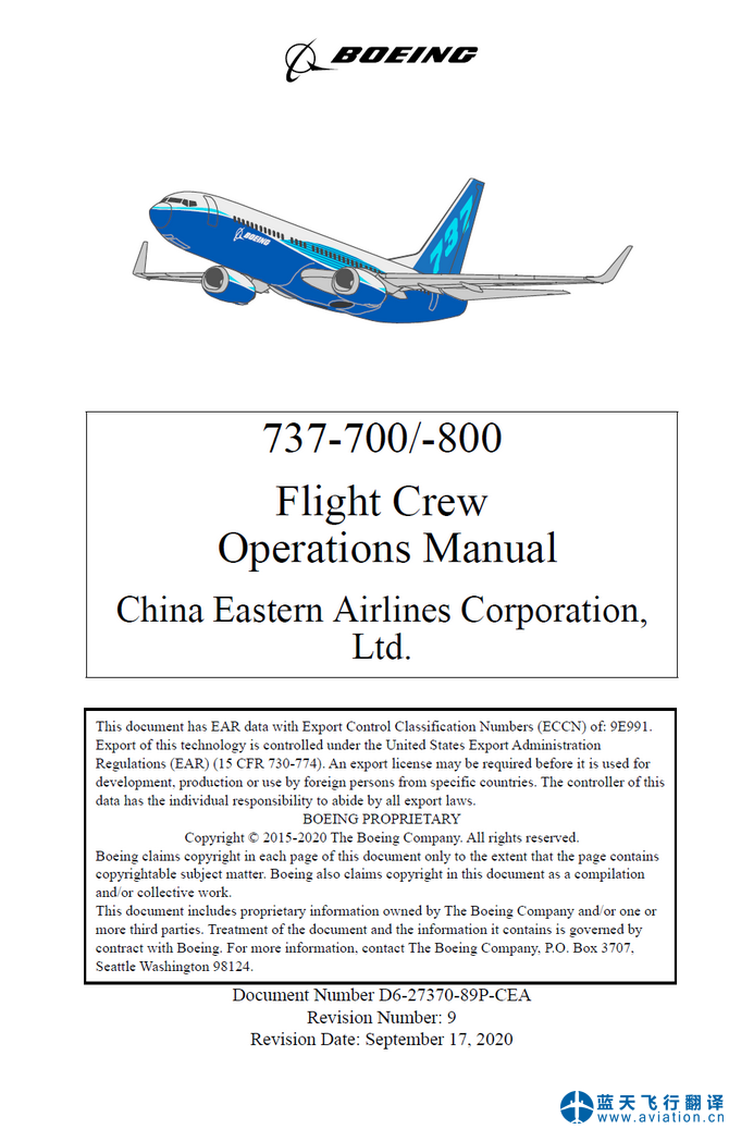 北京藍(lán)天飛行翻譯有限公司完成大型航空公司的2020年9月17日版本波音737-700/-800飛行機(jī)組使用手冊(cè)(Flight CrewOperations Manual FCOM)和快速檢查單(Quick Reference Handbook QRH)翻譯任務(wù) 737-700/-800 Flight CrewOperations Manual and Quick Reference Handbook Translation