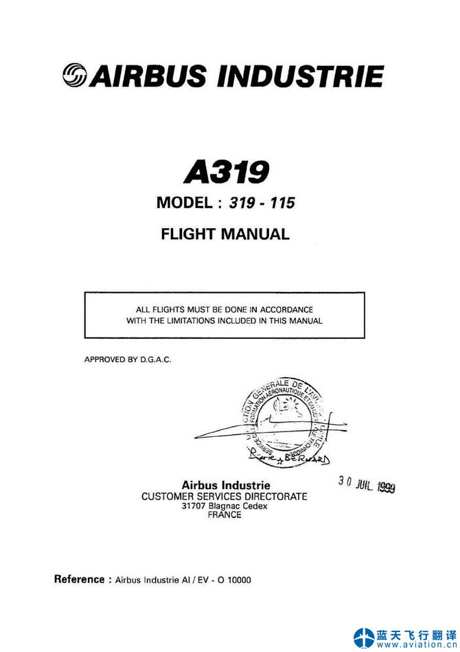 北京藍天飛行翻譯公司本次翻譯的ACJ319構型為319-115,ACJ319飛行機組操作手冊和ACJ319快速檢查單修訂日期為2020年11月30日,ACJ319飛機飛行手冊修訂日期為2020年12月8日。