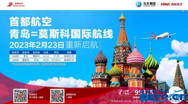 首都航空青島=莫斯科國際航線將采用空客A330寬體客機執飛,每周兩班,由上海、深圳、長沙、鄭州等城市出發的旅客可搭乘航班至青島,當日即可由青島出發前往莫斯科。旅客可通過首都航空官網、APP、微信公眾號、服務熱線95375、各直屬售票處及授權代理購買機票。此外,首都航空還為旅客提供留學生行李額多贈、優選座位、預付費行李等多元化產品,以滿足不同旅客的出行需求。 根據航班計劃,首都航空青島=莫斯科國際航線去程航班號JD495,將于14:15從青島起飛,當天17:35飛抵莫斯科;回程JD496航班計劃于19:55自莫斯科離港,次日7:55落地青島。(時間均為當地時間,航班信息以官網查詢為準)莫斯科是俄羅斯重要的工業制造業中心、科技、教育中心,也是世界著名的古城,擁有眾多名勝古跡,是歷史悠久的克里姆林宮所在地。莫斯科城市規劃優美,掩映在一片綠海之中,故有“森林中的首都”之美譽。伴隨著首都航空青島=莫斯科航線的恢復,將為青島及周邊旅客的赴俄提供更為多元、便捷、舒適的出行服務。 莫斯科是俄羅斯重要的工業制造業中心、科技、教育中心,也是世界著名的古城,擁有眾多名勝古跡,是歷史悠久的克里姆林宮所在地。莫斯科城市規劃優美,掩映在一片綠海之中,故有“森林中的首都”之美譽。伴隨著首都航空青島=莫斯科航線的恢復,將為青島及周邊旅客的赴俄提供更為多元、便捷、舒適的出行服務。