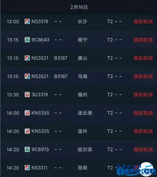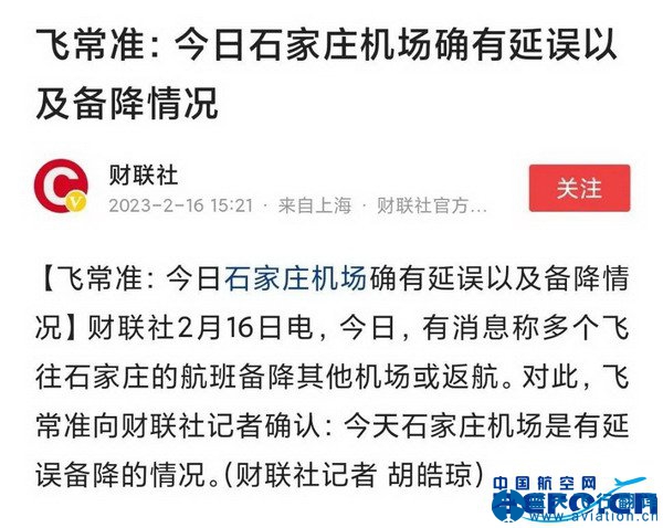 2月16日,有消息稱(chēng)中午前后多個(gè)飛往石家莊的航班備降其他機(jī)場(chǎng)或返航。有網(wǎng)友稱(chēng)是大霧原因,還有網(wǎng)友稱(chēng)石家莊上空全部都是軍機(jī)。